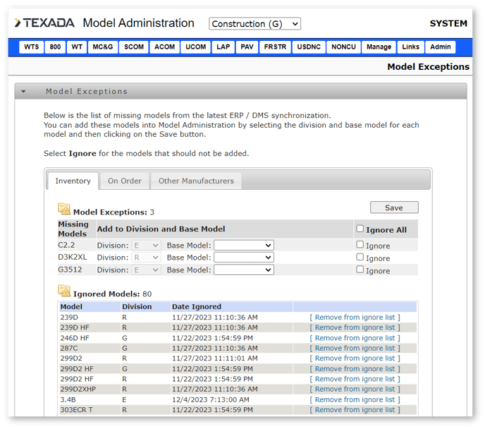 Missing models are organized into three categories: Inventory, On Order, and Other Manufacturers. Switch between categories using the tabs at the top of the screen. Each category contains a “Model Exceptions” section and an “Ignored Models” section.