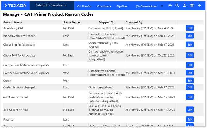 For organizations using Version 3 of the Prime Product+ API, Texada will no longer maintain reason mapping directly within Equipment CRM and the Manage - CAT Prime Product Reason Codes secured module will be unavailable. Instead, dealers will be able to manage the mapping of reason values via the Caterpillar dealer portal.