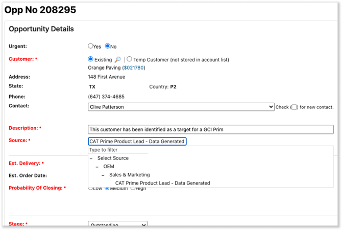 This update adds two new options to the “Source” drop-down on the Opportunity details page in Equipment CRM: CAT Prime Product Lead - Customer Generated and CAT Prime Product Lead - Data Generated.