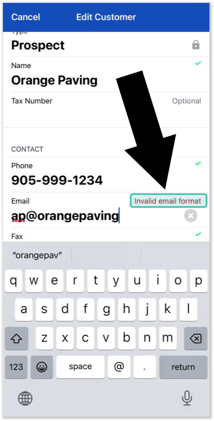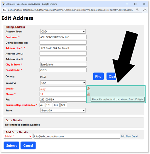 Data Quality Enforcement also applies in Equipment CRM Mobile. Data validation will be performed in real time as the user modifies company or contact information, and invalid records will be flagged with red text indicating why the value is invalid: