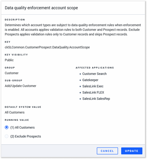 The Data quality enforcement account scope (ckSLCommon.CustomerProspect.DataQuality.AccountScope) configuration key determines which account types are subject to data quality enforcement rules when enforcement is enabled. This key has two possible values: