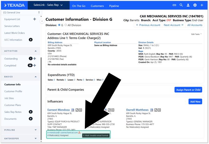 Invalid data will also be flagged on the Customer Information screen. Hover your mouse over any red triangles you see to learn more about why a given record was flagged.