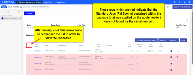 - Note the serial numbers highlighted in red as those indicate that the Standard Job Events contained in the applied Package (on the quote header) were not found for that serial number).