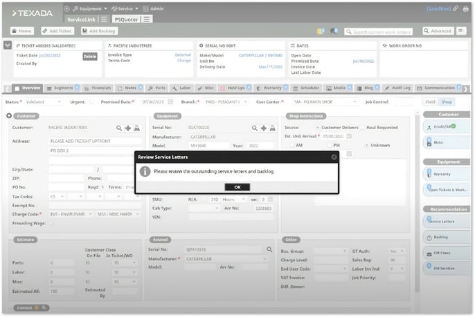 Clicking ‘OK’ in this popup will open the Service Letters and Backlog popsicles, giving the user a chance to review the customer’s service letters and backlog items.