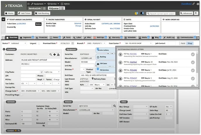 When a user with the Ticket.Backorder.ServiceLetter.FirstSave.View permission enabled creates a new work order in Texada ServiceLink, the “Review Service Letters” popup will appear if any outstanding service letters or backlog items exist for the customer.