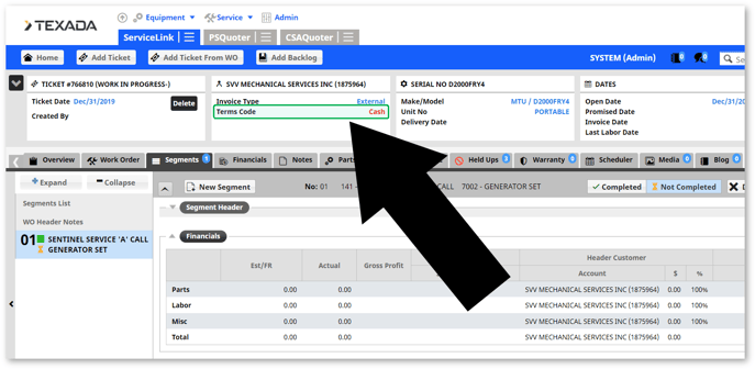 In ServiceLink Flex, the customer’s terms code will now be indicated at the top of the work order detail screen: