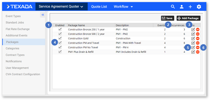 The Packages page allows you to manage the Packages available in Service Agreement Quoting (SAQ). Packages provide a way to group multiple Events (Standard Jobs) and Additional Events together with a set number of occurrences for each Event. These Packages can then be added to Quotes, making it easier to build out Quotes that contain common combinations of Events.