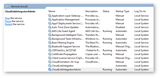 Open Windows services using services.msc from Start→Programs and note that CloudLinkIntegratorAdmin service is started upon installation.