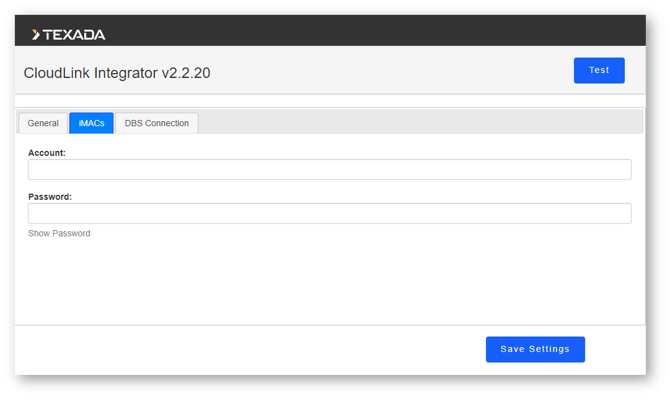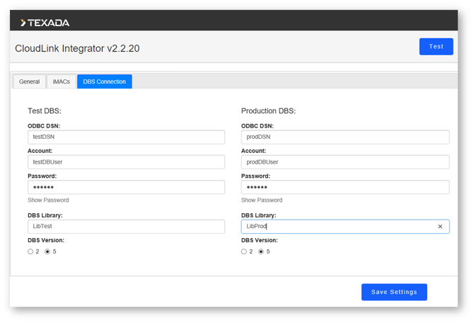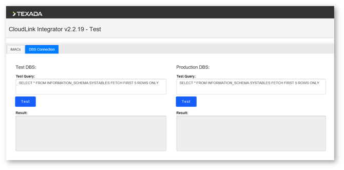 There are two sections for testing the configuration: iMACS and DBS Connection.