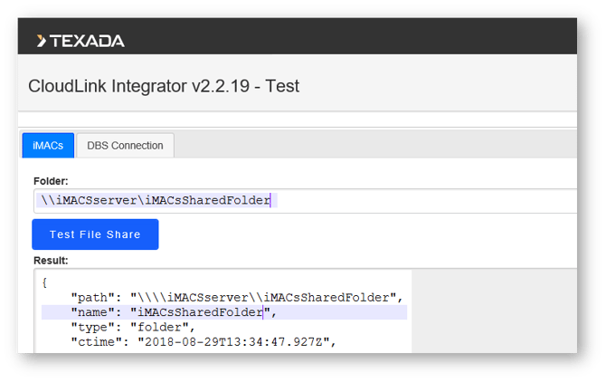 - Expected result: The service account configured in the iMACS section is able to connect to the shared folder.