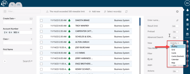 To switch views, simply select the view you want to see. For example, “Grid” view is the most commonly used and will sort the data by account number.