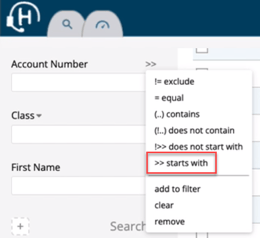 For example, if under the “Account Number” filter, you choose “>> starts with” and enter 2, 6, and 905, the system will display all the accounts whose account numbers begin with those three numbers.