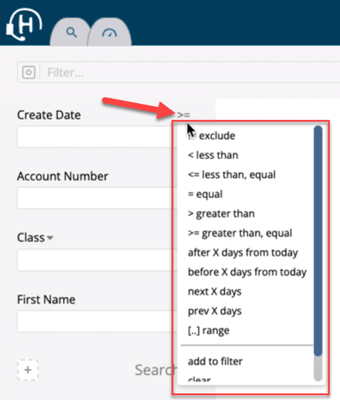 - >= Greater than, equal: See all records with dates/times that match OR that are older than the date/time you enter into the field.