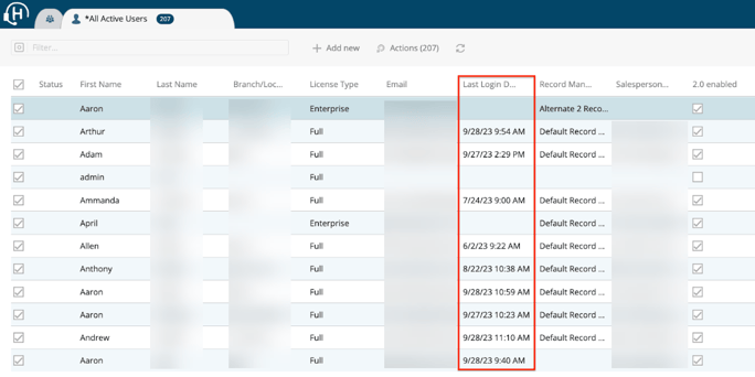 When viewing a list of all active users, the “Last Login Date” column displays the last date the user logged into the Handle system, whether through single sign-on or manual login.