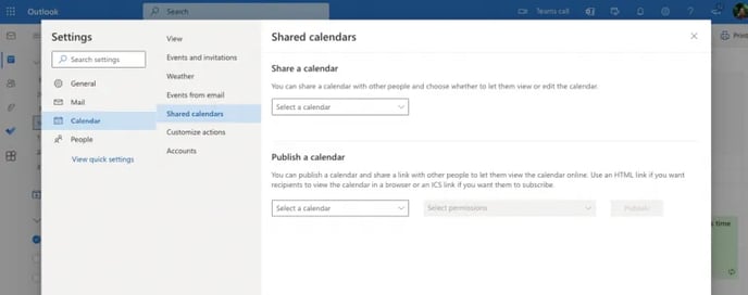 - In Outlook Settings, select Calendar, then Shared Calendar