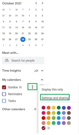 - Click on the 3 dots next to your Calendar’s name and select “Setting and Sharing”