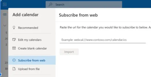 - Go to your Outlook Web Calendar, click on Add Calendar on the left side of your screen