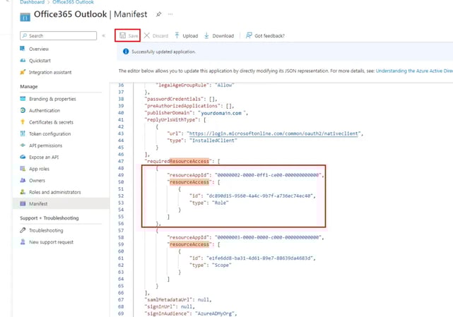 Select Manifest in the left-hand navigation under Manage. Locate the requiredResourceAccess property in the manifest, and add the following inside the square brackets [ ]:
