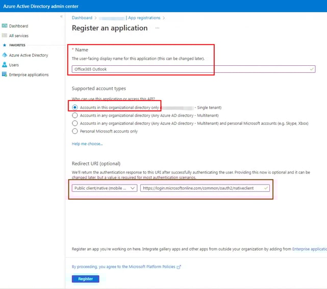 - For Redirect URI, change the dropdown to Public client (mobile & desktop) and set the value to https://login.microsoftonline.com/common/oauth2/nativeclient