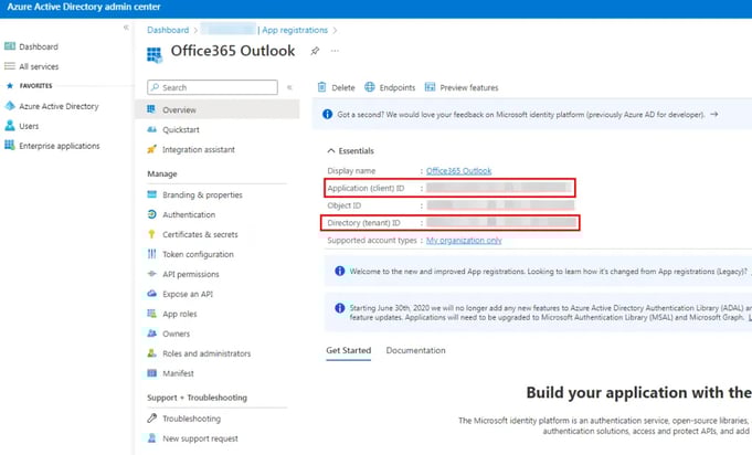 7) Select Overview and copy Application ID and Tenant ID to use them in Exchange sync.