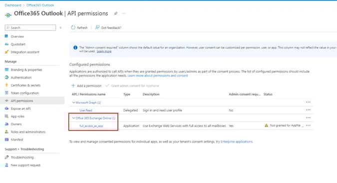Select API permissions under Manage. Confirm that the full_access_as_app permission is listed. Select Grant admin consent for org and accept the consent dialog.