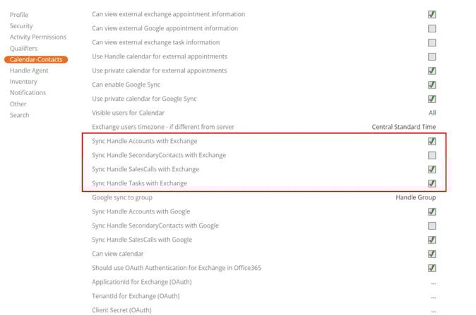 The following instructions are for setting up Handle/Exchange syncing for one user at a time. If you need to set up many users at once, contact Texada support and we can adjust to multiple users settings for you.