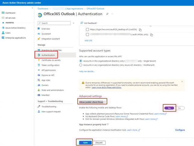 After registration, select Authentication in the left-hand navigation under Manage and set Yes for Allow public client flows and Save configuration.