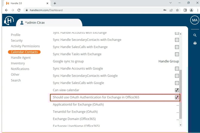 In order to enable OAuth authentication with Office365 Outlook for a specific user in Handle, have a Handle admin user log in to https://handlecrm.com/Dashboard, open Admin Tools and go to Calendar-Contacts.