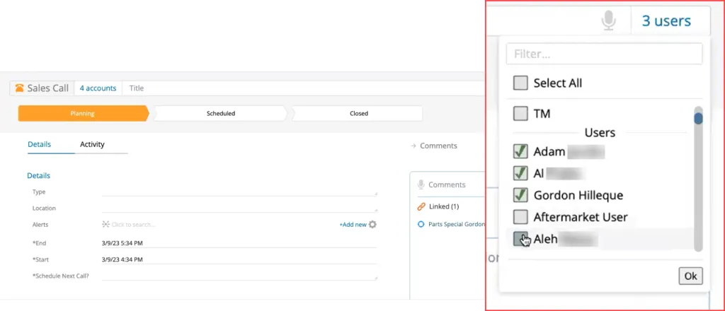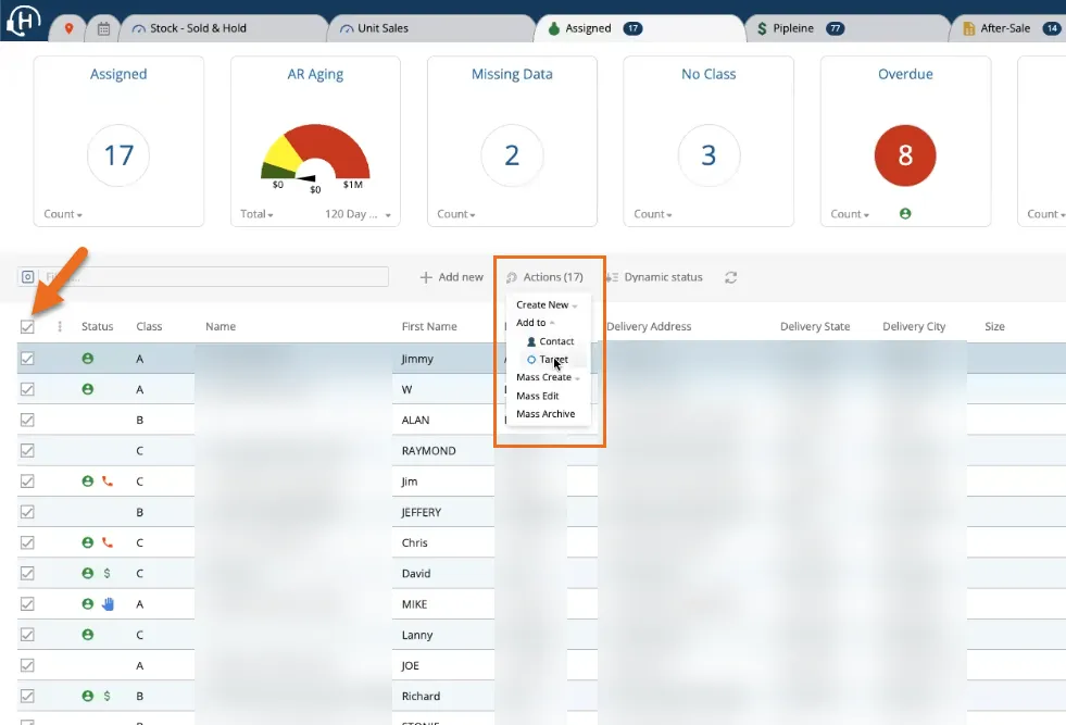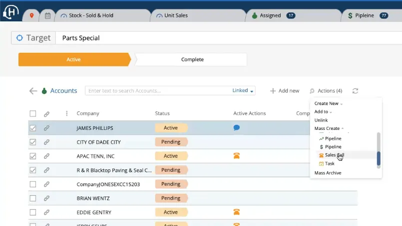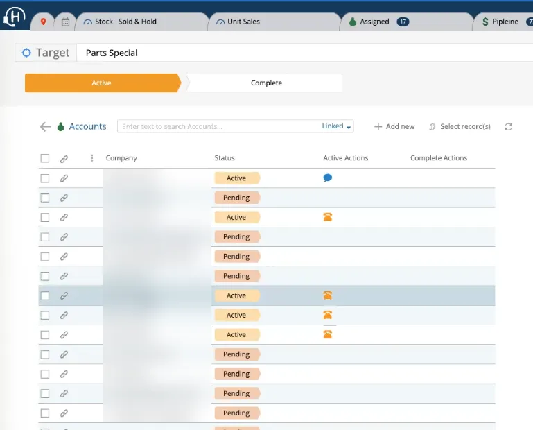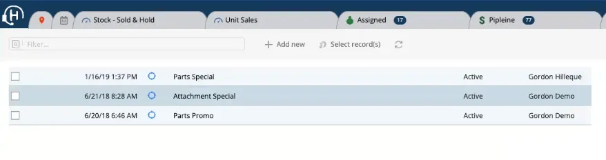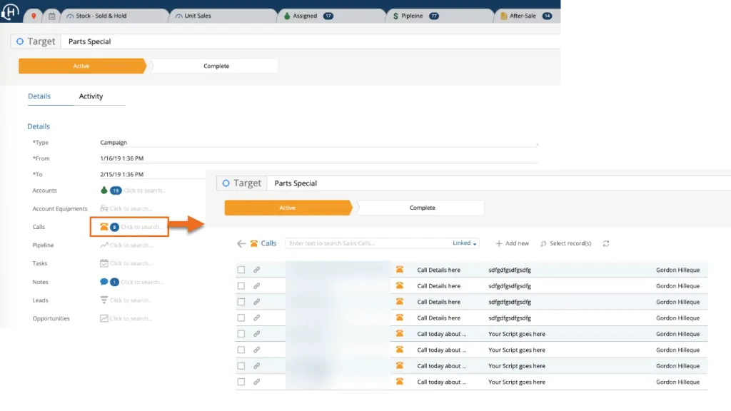 For example, you might want to reach out to 50 customers about a parts special, so you assign all 50 customers to your Parts people. These calls can be made by anyone on the team, and when completed, that customer is taken off the list for everyone to avoid duplicate calls.