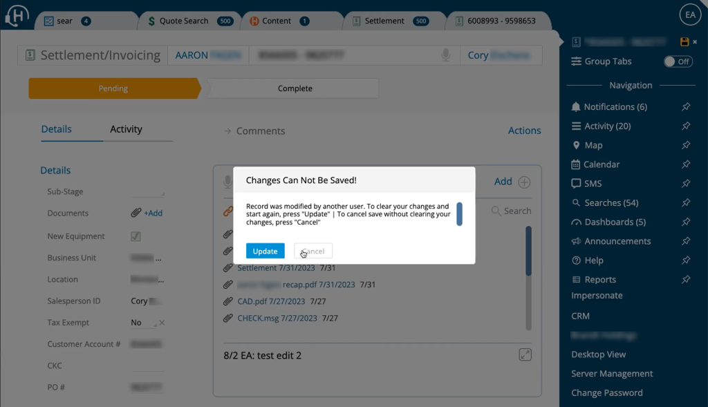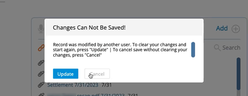 The Save Over feature constantly checks to see if changes are being made — whether by another user or by an automated sync with another application. If it detects changes, it warns you that the record has been modified by another user and prevents you from saving the record.