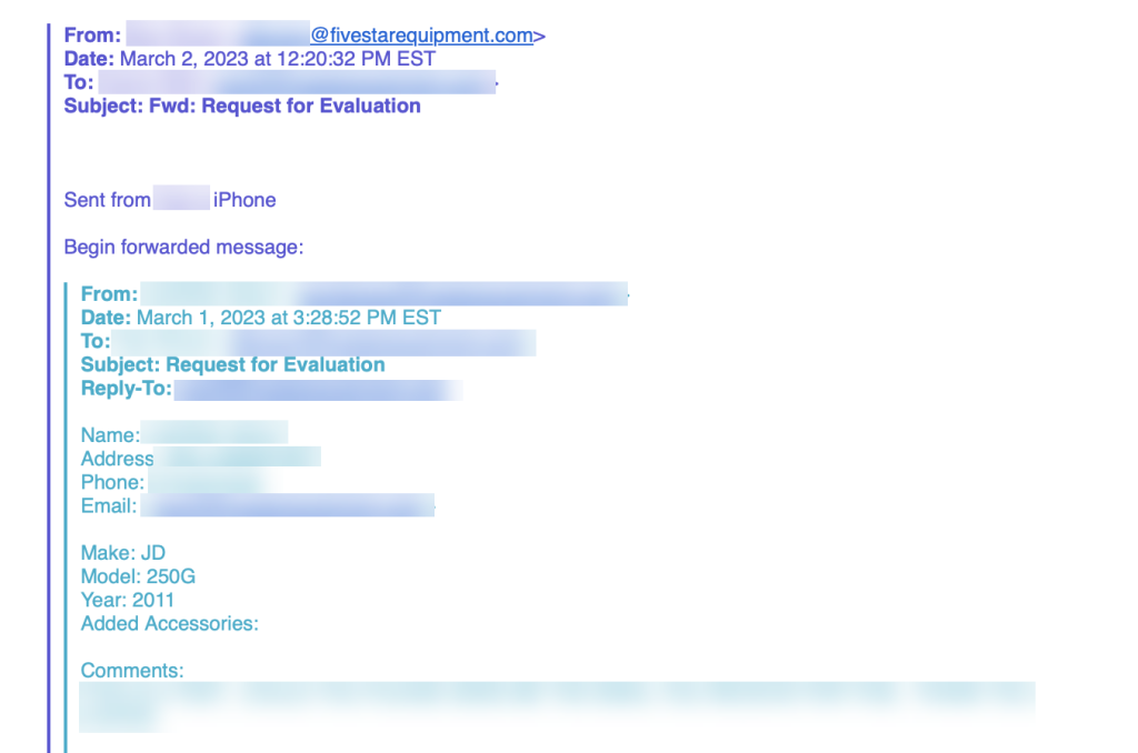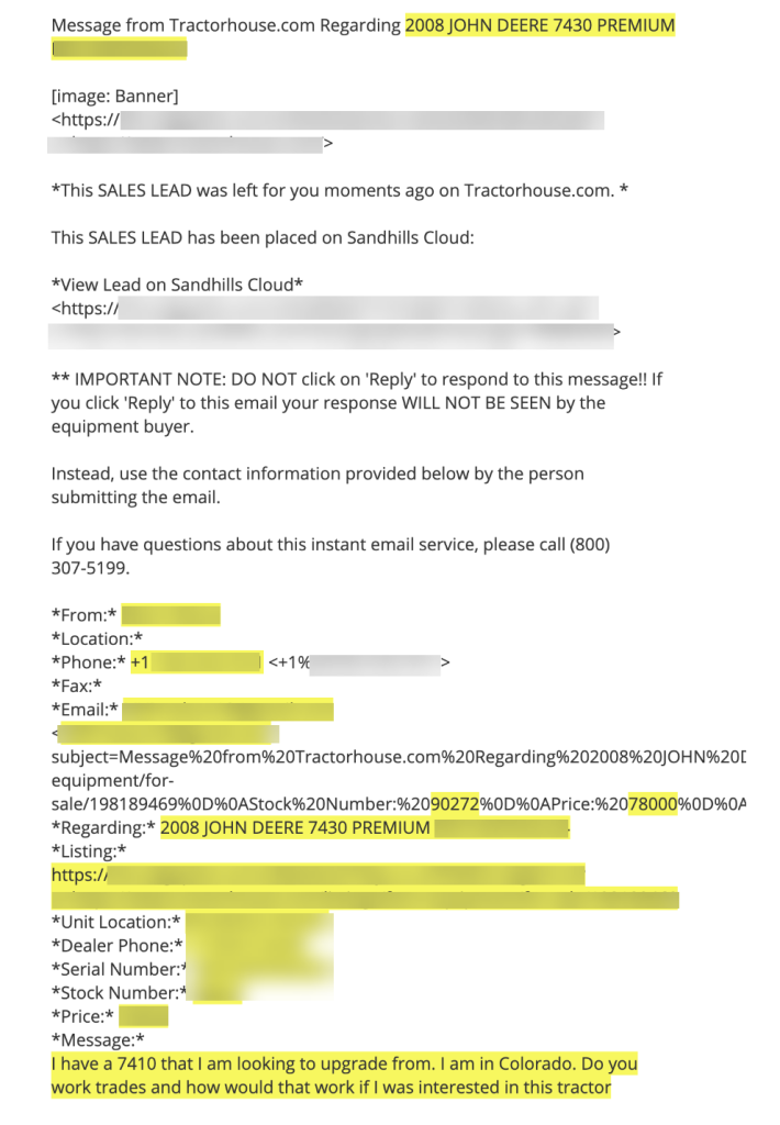 Your business has likely set up lead sources, such as website forms, John Deere MachineFinder, and Protec. When a lead is generated, these sources send you an email alerting you to the lead.