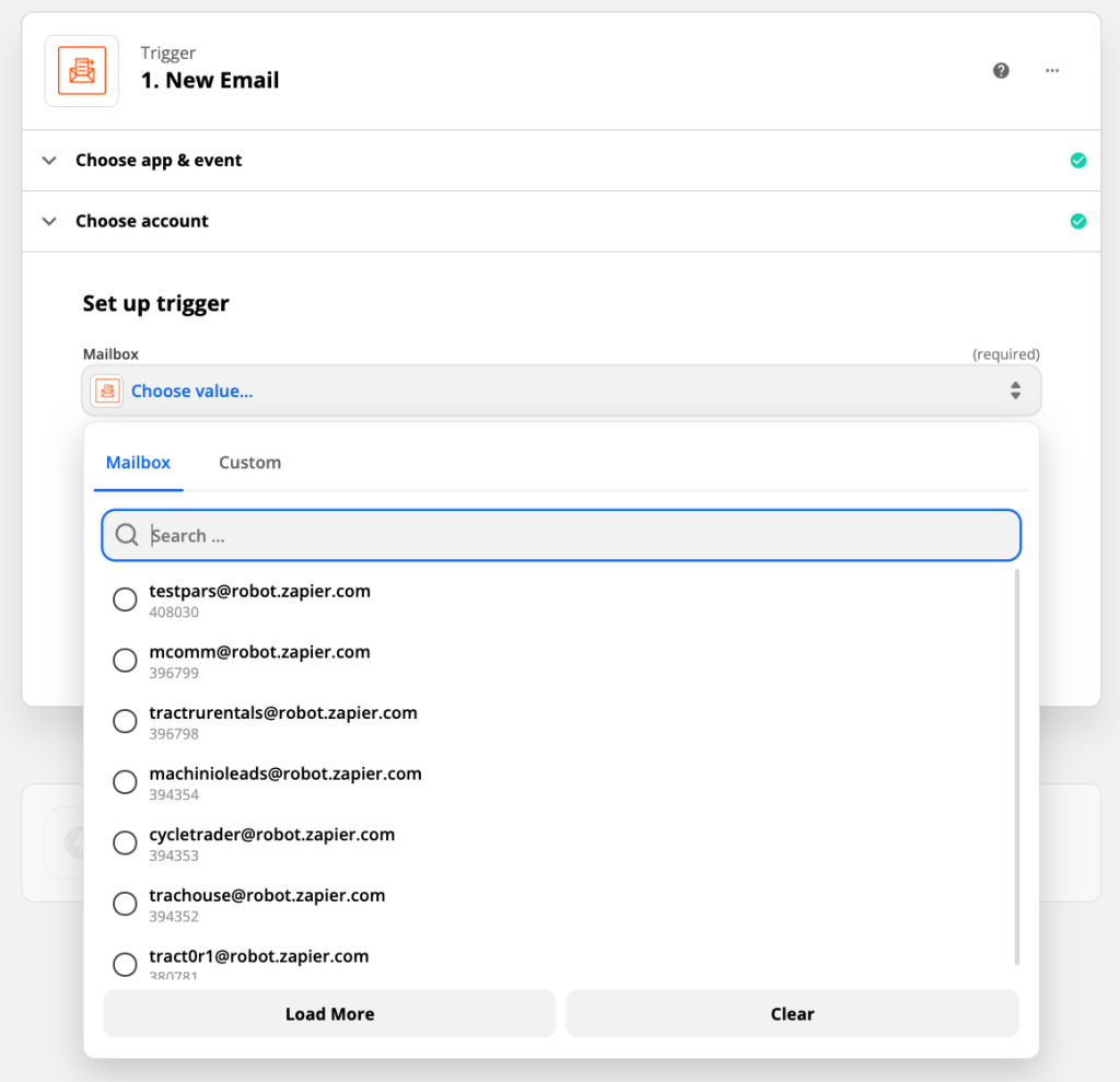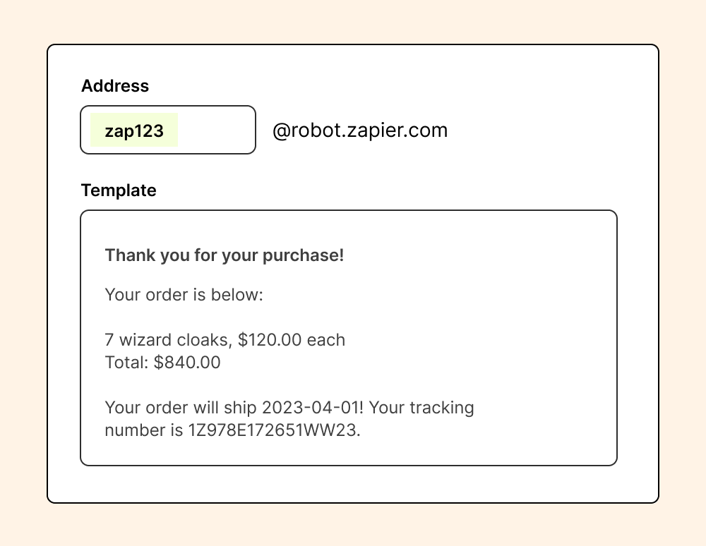 1: Create a mailbox with a custom Zapier email address, like zap123@robot.zapier.com. It’s a good idea to create an address that identifies the lead source. Then send an email to Zapier to use as your template.