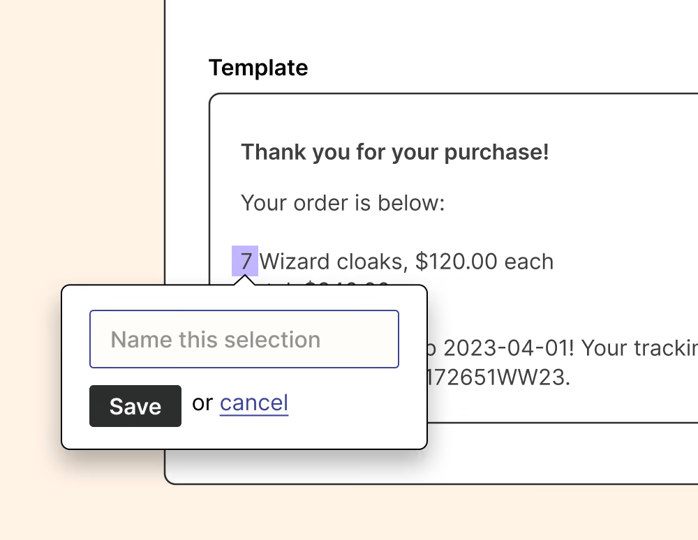 2: Highlight and save the text in your template that you want to extract from future emails. Give each snippet a name that describes the type of data you’re highlighting.