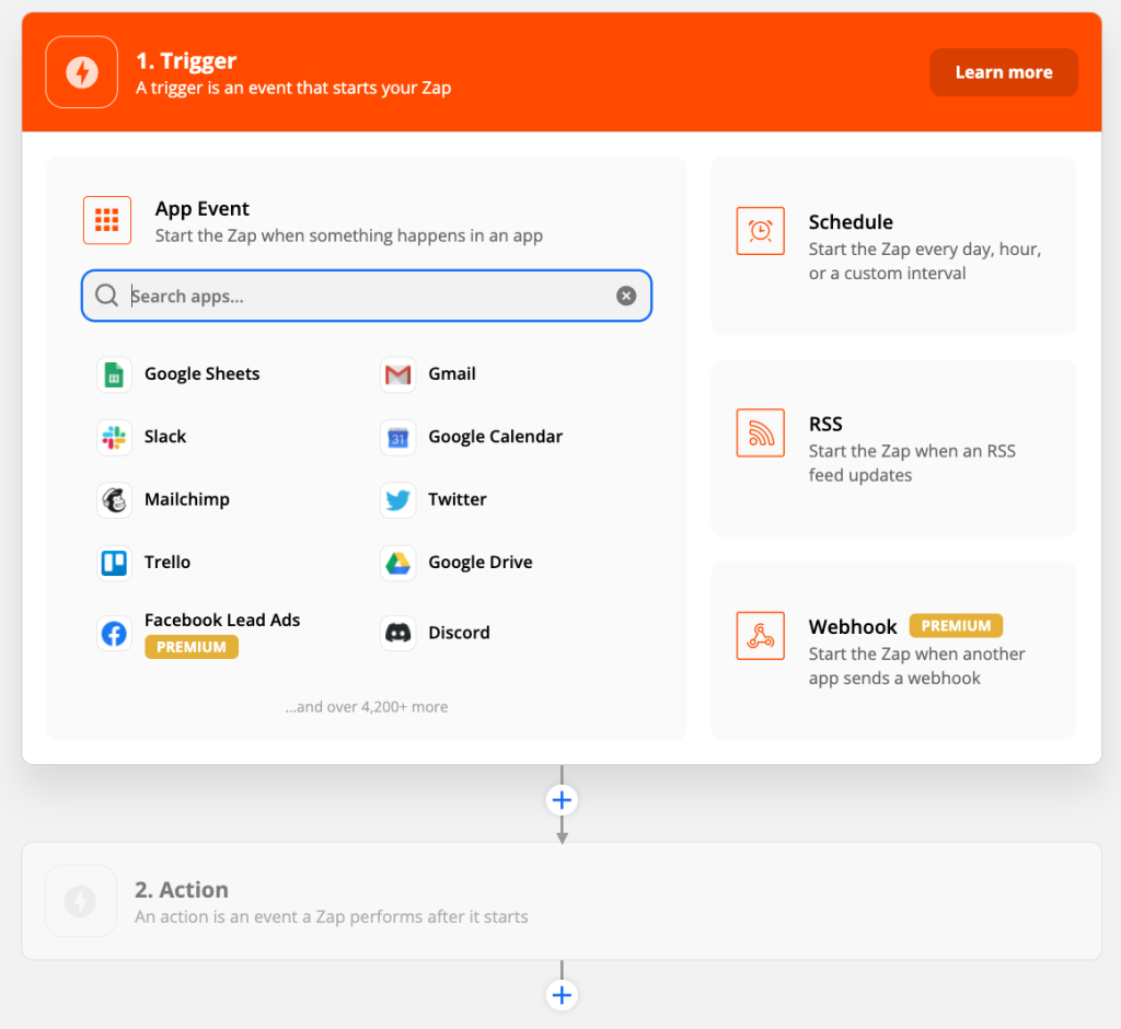 2: Set the “Trigger.” You can search apps to find the app that will trigger the Zap.