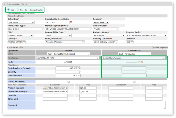 - Yes: The Manufacturer, Model, Cust. invoice w/o trade, and Quantity fields under “Competitors” will be mandatory.