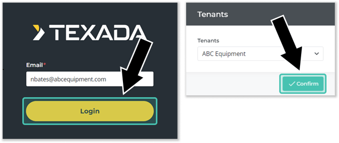 - Enter your email address and click “Login”, then select a tenant and click “Confirm”.