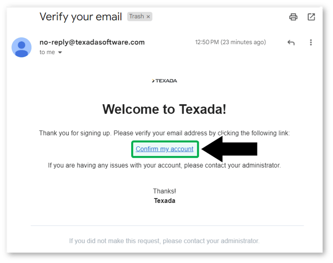 - Check the inbox of your login email address. You will receive 2 emails from no-reply@texadasoftware.com. If you don’t see these emails, check your spam folder. If you still haven’t received these emails after some time has passed, click the “Resend Verification Email” button again to resend the welcome package.