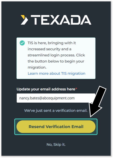 - Upon reaching the TIS migration message, click “Resend Verification Email” to send a TIS welcome package to your login email address. Upon a successful send, you will see a “We’ve just sent a verification email” message. Proceed to step 5, but leave this page open – it will redirect automatically once you’ve completed your migration!