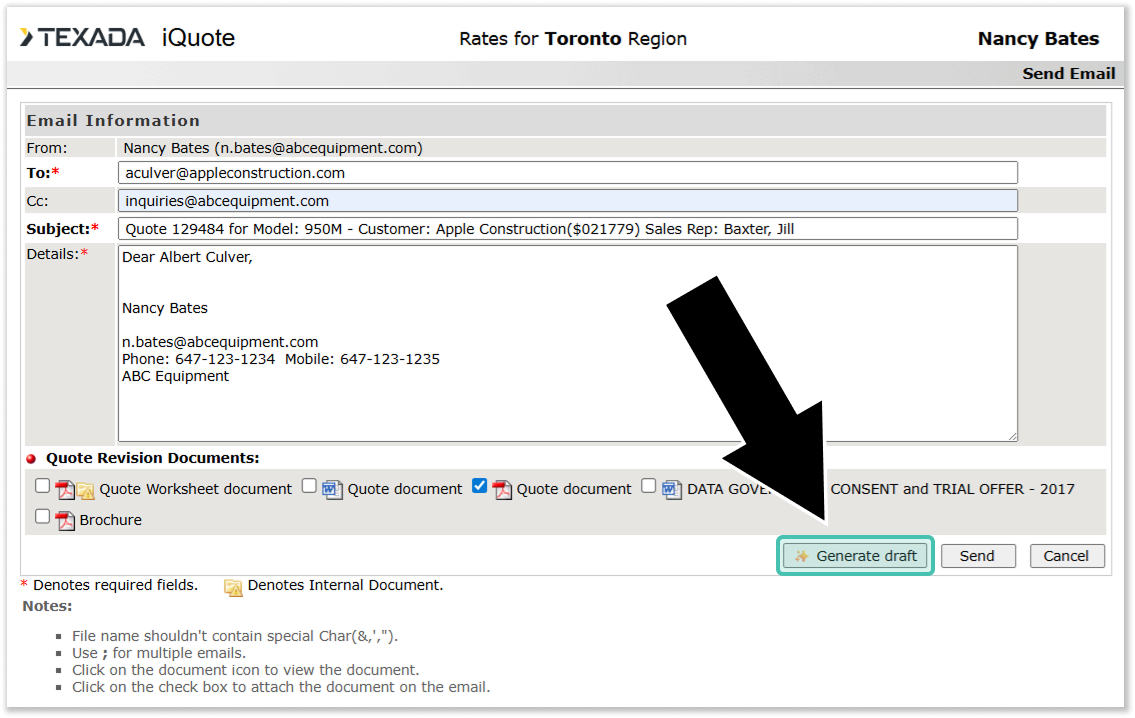 This feature leverages artificial intelligence to generate accurate, professional, and comprehensive quote summary emails using existing quote and equipment brochure information. From the Send Email screen, simply click the new “Generate draft” button to draft an email in a matter of seconds.