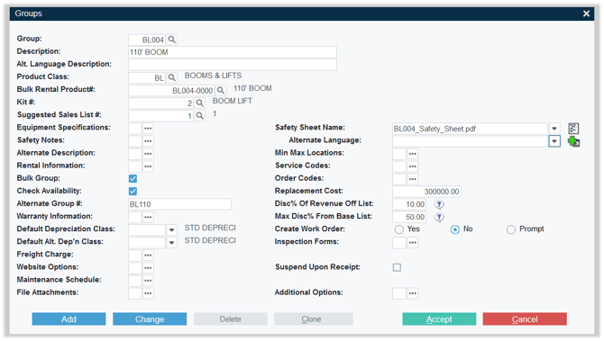 Groups are the middle level of organization, situated between Classes and Products. A Group represents a group of similar Products, such as 110’ Boom Lifts, 25KW Generators, or 50-Ton Hydraulic Jacks.