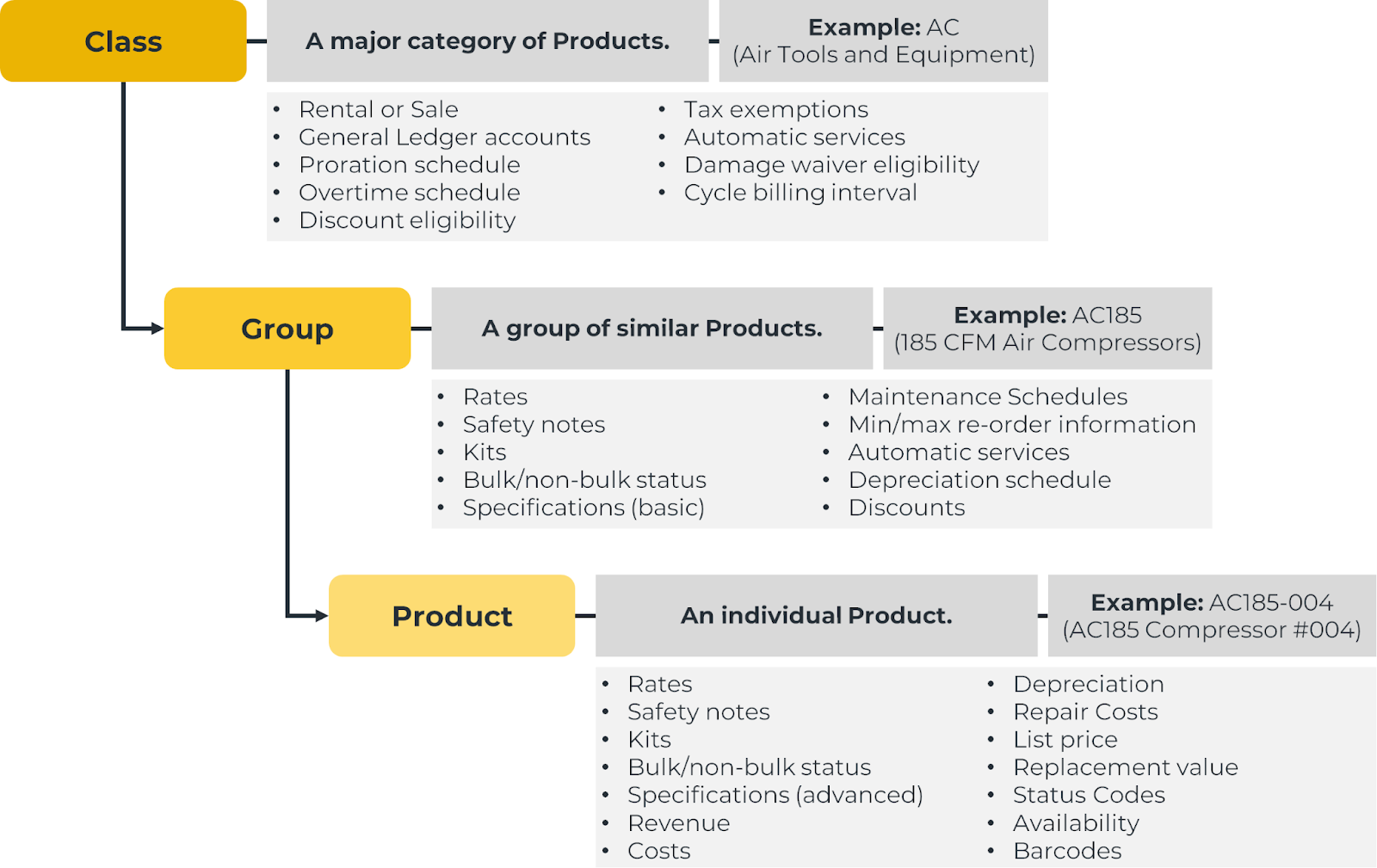 Asset categorization and organization is a key aspect of managing an equipment business. In Service, Rental, and Financials, Products are categorized using a three-tiered system that aligns with standard industry practices. All Service, Rental, and Financials products – including (Classic), (Next), Mobile, and E-Commerce – share this system, so understanding it is critical.