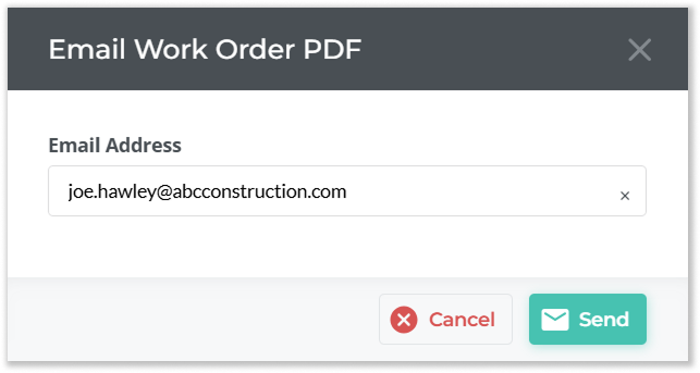 - Enter the email address of the person to which you’d like to send the Work Order, then click “Send”. A PDF version of the Work Order will be sent to specified address.