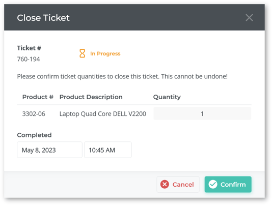 Clicking this button will cause the following pop-up to appear, asking you to confirm which Assets were returned on the Ticket and enter the date and time on which the Ticket was completed. Enter the appropriate values into the “Quantity” and “Completed” fields, then click “Confirm” to close the Ticket.