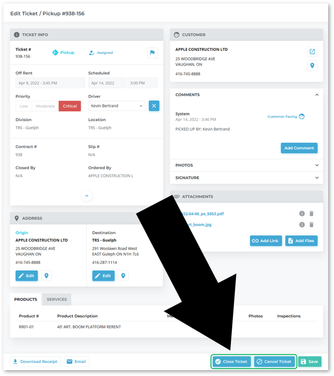 Click the “Cancel Ticket” or “Close Ticket” buttons in the bottom-right corner of the screen to cancel or close the Ticket. If the “Cancel Ticket” button is not visible, the Ticket cannot be canceled in its current status.