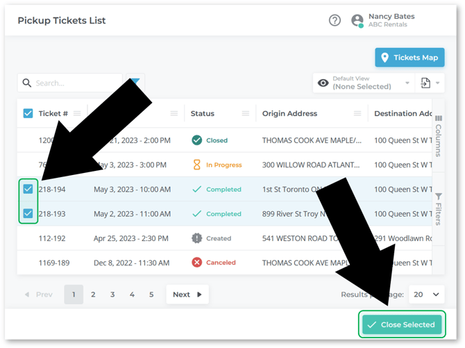 In addition to the above method for closing a single Ticket, it is possible to bulk close Pickup and Delivery Tickets via the Ticket List page. Note that it is only possible to close Completed Tickets in this manner.