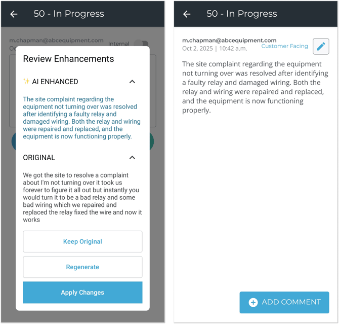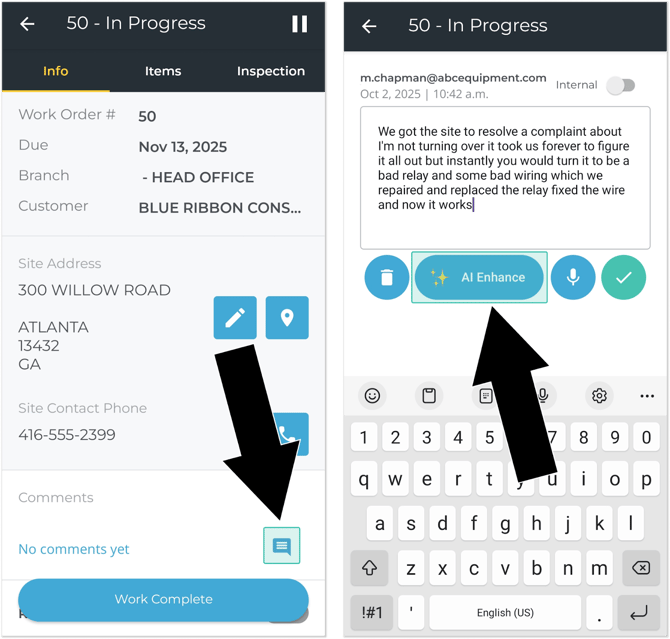 Mobile’s existing talk-to-text functionality gives mechanics the ability to dictate comments to their smart device. This feature is ideal for leaving quickly taking notes in the field or on the shop floor without lengthy typing sessions. Now, these comments can be further refined thanks to a new “AI Enhance” button!