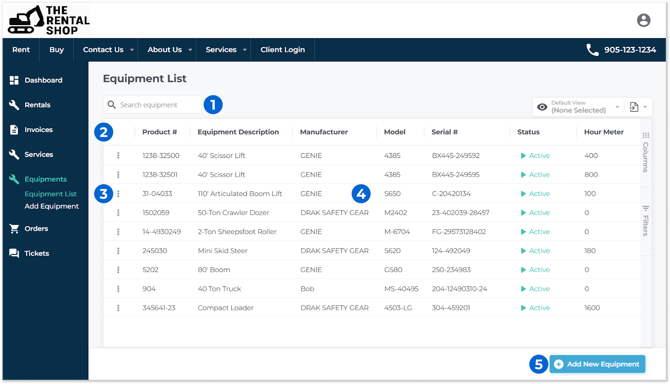 Each row in the Equipment List table represents a customer-owned Asset. Click on an Asset’s row to open its details. - Add New Equipment Button