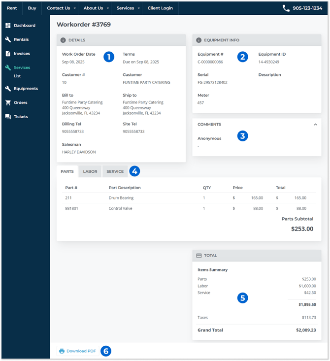 This panel contains the Parts, Labor, and Service totals for the Work Order, as well as any applicable taxes. - Download PDF Button