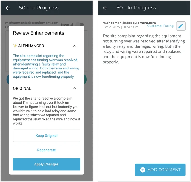 Mobile’s existing talk-to-text functionality gives mechanics the ability to dictate comments to their smart device. This feature is ideal for leaving quickly taking notes in the field or on the shop floor without lengthy typing sessions. Now, these comments can be further refined thanks to a new “AI Enhance” button!