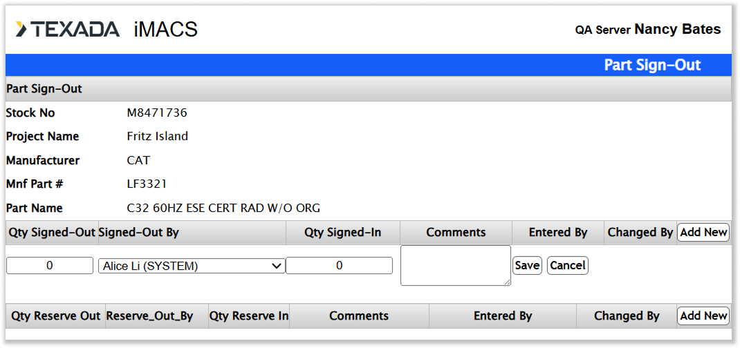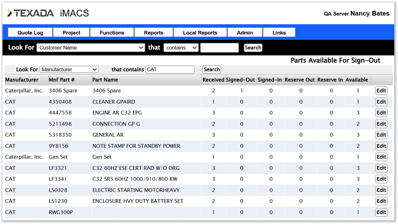Click the “Edit” button next to a part to open the Part Sign-Out window. This allows you to sign parts in or out, and attribute this action to a Texada user of your choice.